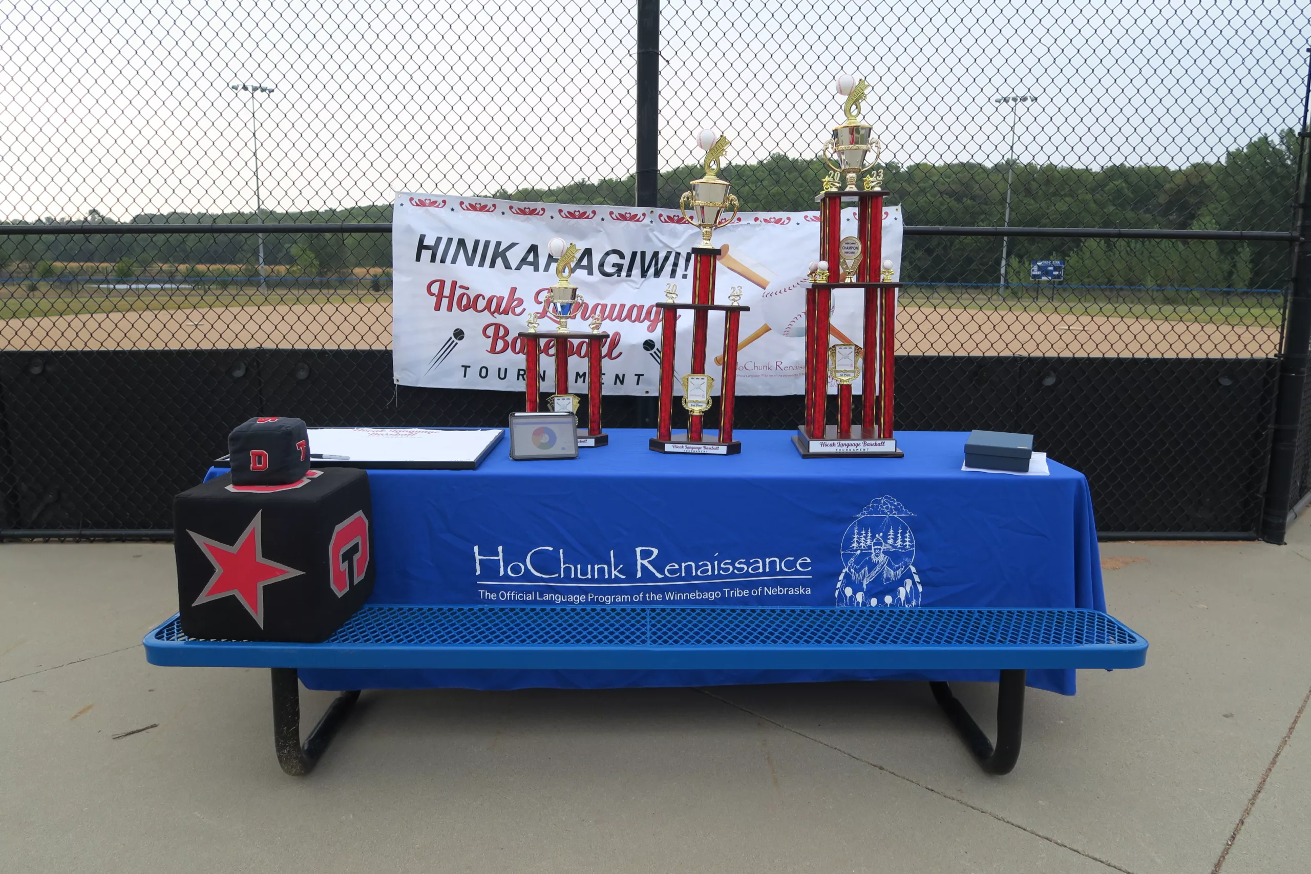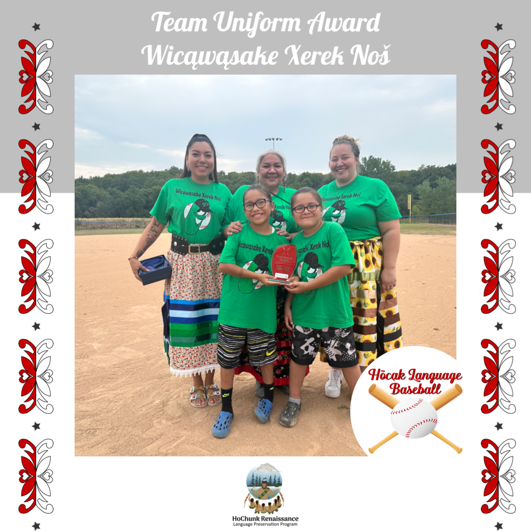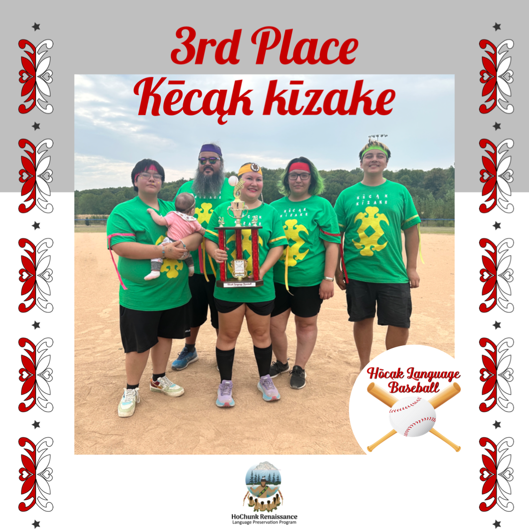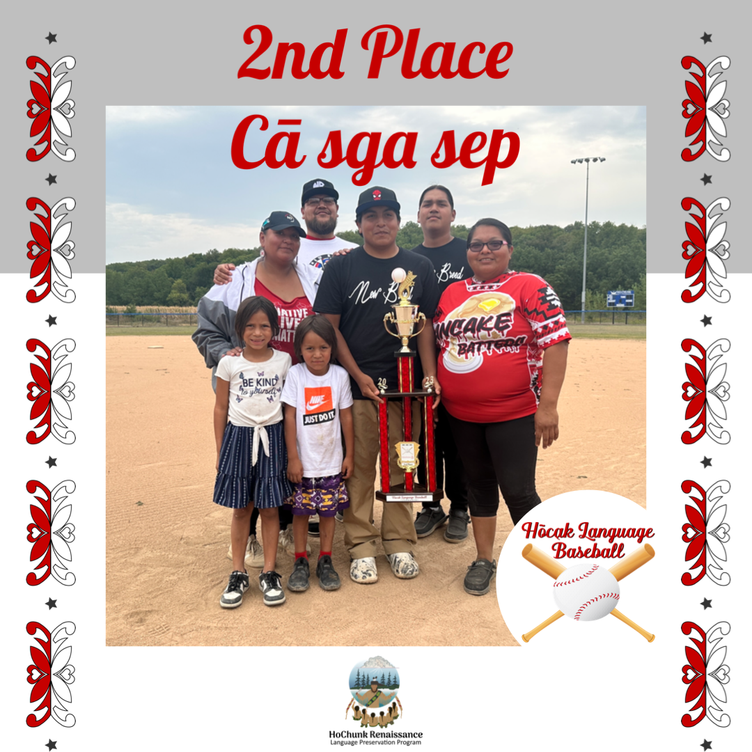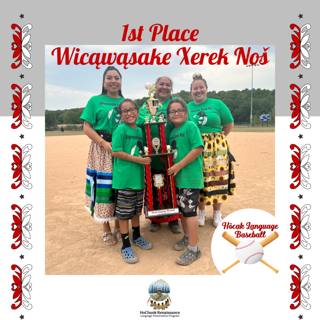 It was a gorgeous day for the Hōcąk Language Baseball Tournament, we started at 9am with a prayer and we started playing. We also enjoyed muffins, nachos, hotdogs, pickles, yogurt and candy. We really enjoyed everyone who came out to watch and to those that participated.